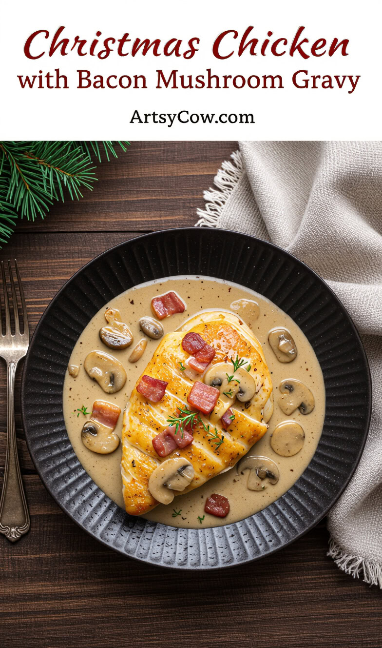 Enter Christmas Chicken with Bacon Mushroom Gravy—a centerpiece that looks fancy, tastes stunning, and doesn’t require a side of stress to achieve.