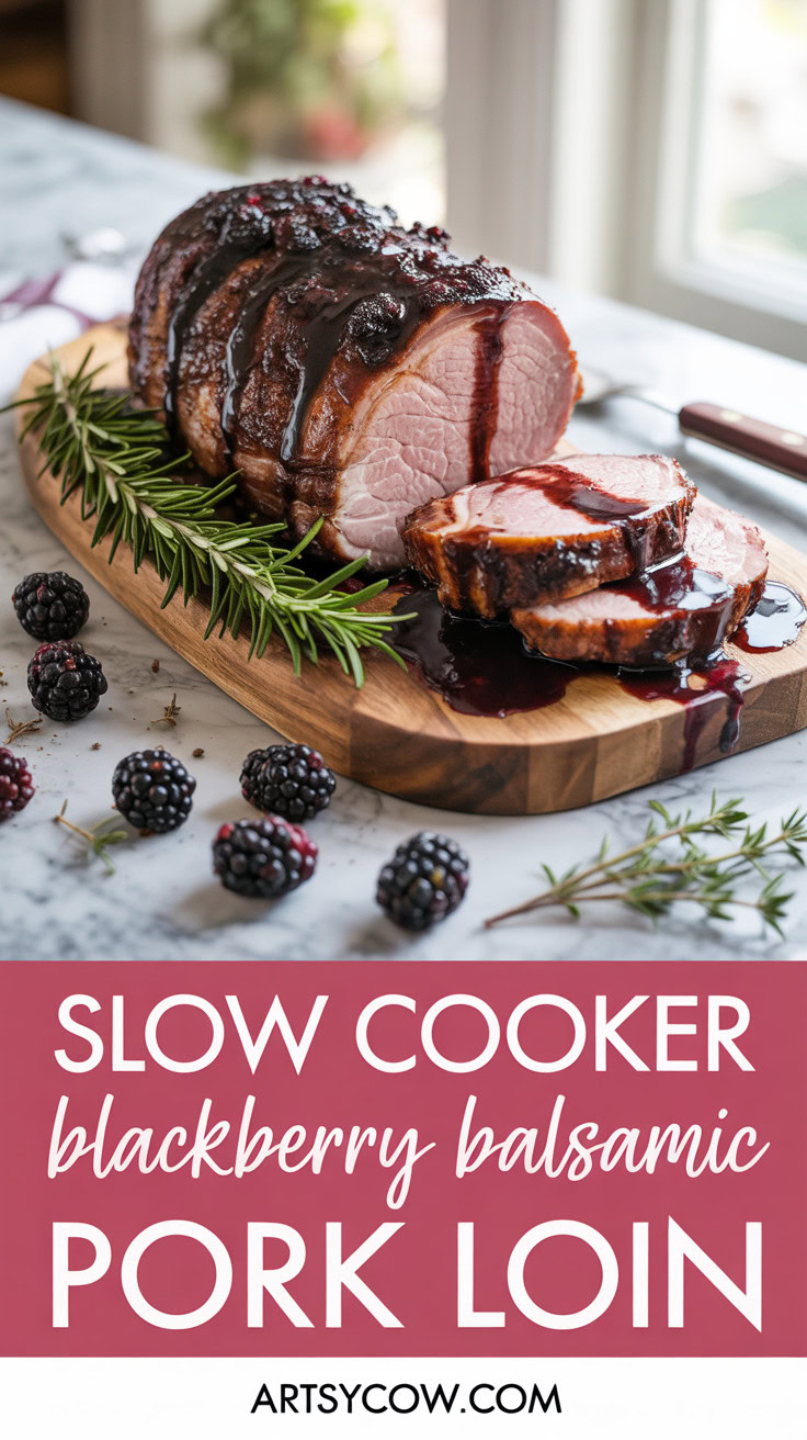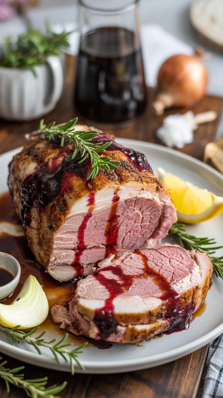 - Slice the rested loin across the grain into medallions and spoon the glossy blackberry balsamic sauce over the top.